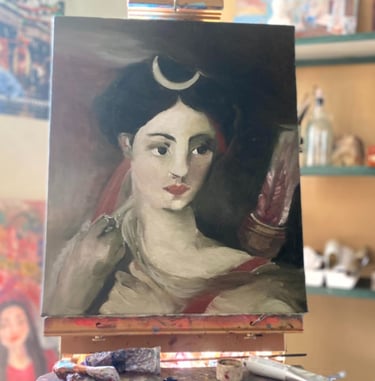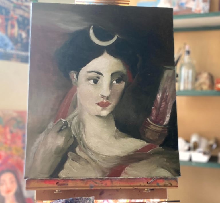 Diane, la déesse chasseresse, apparaît dans une aura de mystère et de liberté. Elle incarne la force féminine indomptable, celle qui avance seule dans la nuit, guidée par la lune. À travers ce tableau, c’est l’image d’une femme autonome, farouche et lumineuse qui se dessine — à la fois protectrice et insaisissable.